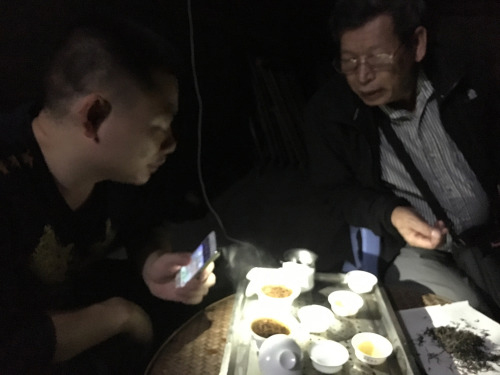 Sitting outside in a pleasant, not too mosquito filled night, with Mr. Yan and his grandnephew. I remember young Mr. Wang, his apprentice, from nearly 13 years ago. Now he owns a relatively big tea business, married with two kids, but is just as obsessed and serious about tea as he was as a young apprentice. Lack of lighting and being in the middle of the night is not daunting- he needed to analyze the batches of dark roasted oolongs for whether 30 hours roasting was yet enough- by iPhone light! Then, it was time to bag and seal some teas, and I was instructed, how to feel the correct temperature warmth in the tea out of the roaster, to seal it so that the moisture absorbed from the air was just the right amount. So much to forever learn.